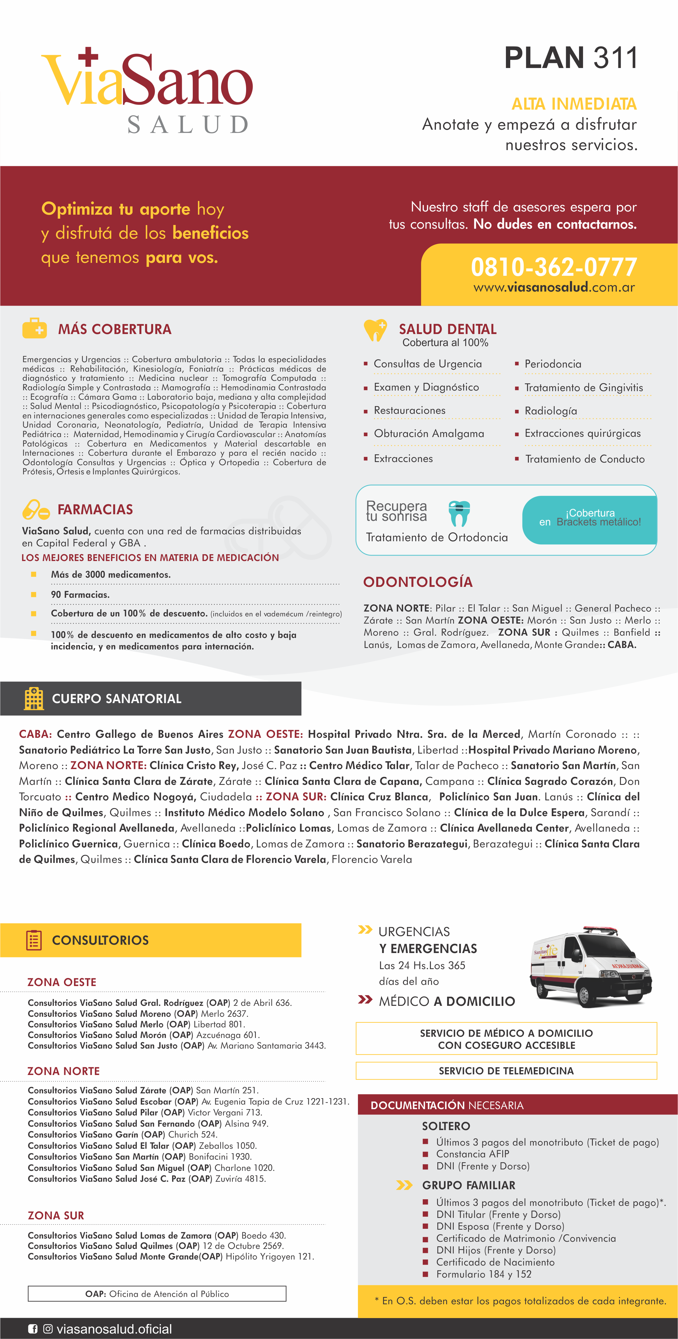 - Internación Programada y de Urgencia: Con una Red de más de 50 Clínicas y Sanatorios con tecnología avanzada